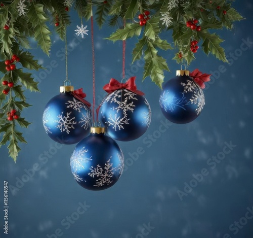 Fototapeta premium Hanging Christmas ornaments on a blue background with snowflakes and holly leaves, ornaments, christmas tree
