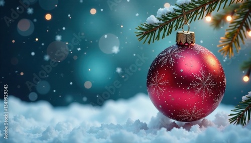 Fototapeta premium Hanging festive glass ball decoration against a winter wonderland background, decorations, winter
