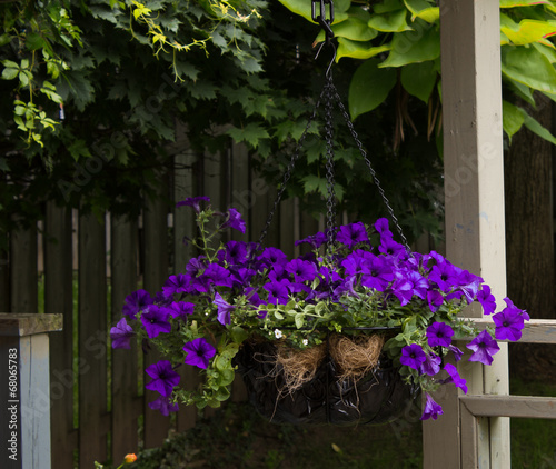 © Steve693, Fototapeta premium Hanging flower basket in backyard