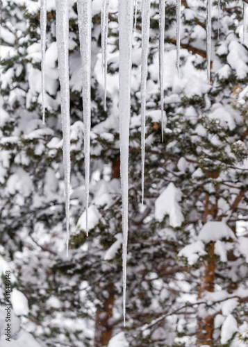 Fototapeta premium Hanging icicles on background trees