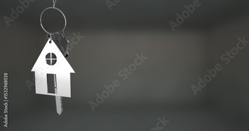Fototapeta premium Hanging metallic house-shaped keychain and door key reflecting on dark grey backdrop, copy space