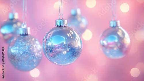 © ArtificialHorizons, Fototapeta premium Hanging silver and blue Christmas ornaments on a soft pink background creating a festive and dreamy holiday atmosphere