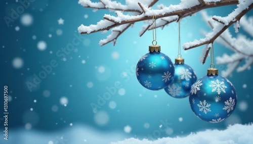 © Prayad, Fototapeta premium Hanging spherical decorations in shades of blue and white with snowflake patterns on a branch, branch, frosty, winter