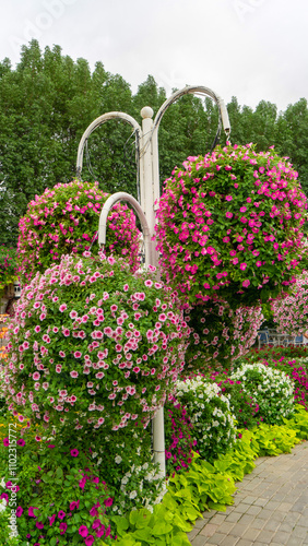 © Olga Bryukhova, Fototapeta premium Hanging vases with pink petunia flowers in miracle garden in Dubai, United Arab Emirates. Vertical image