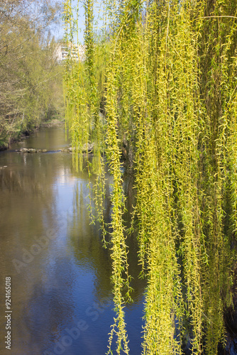 Fototapeta premium Hanging Willow Branches Over Calm River Waters