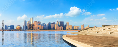 Naklejka premium Hangzhou city skyline and empty wooden platform