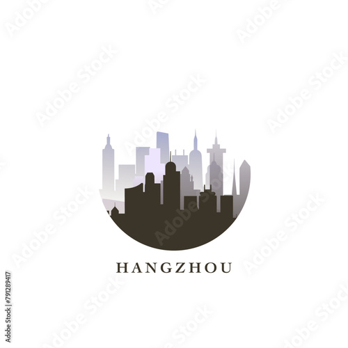 © Anastasiia, Naklejka premium Hangzhou cityscape, gradient vector badge, flat skyline logo, icon. China city round emblem idea with landmarks and building silhouettes. Isolated graphic