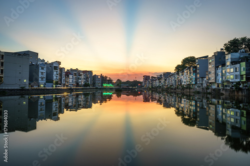 © Hanoi Photography, Naklejka premium Hanoi cityscape at sunset. Resident buildings by Tien Bien lake, Gia Lam district