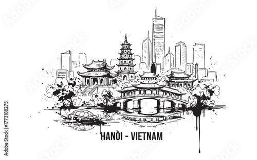 © tarakacraft, Fototapeta premium Hanoi Vietnam Turtle Tower Skyline Engraving Vector Illustration