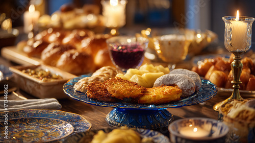 Naklejka premium Hanukkah feast: latkes, doughnuts, challah, and candles on a festive table