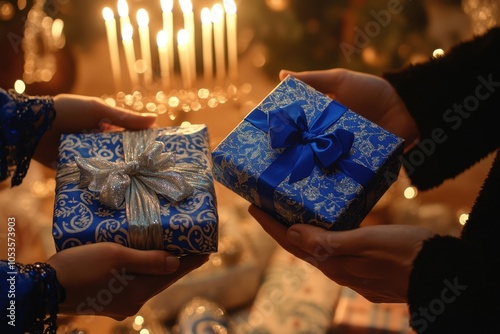 Fototapeta premium Hanukkah Gift Exchange: A close-up of hands exchanging wrapped gifts in festive blue and silver paper with bows. The background shows a decorated room with a lit menorah, symbolizing the tradition of