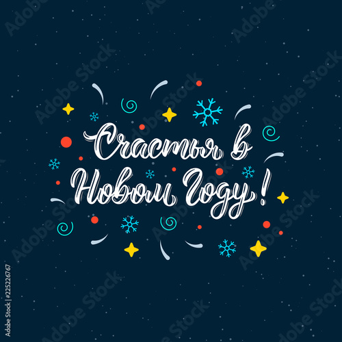 © Bubo4ka, Naklejka premium Happiness in the New Year. Happy New Year russian handwriting inscription. Cyrillic calligraphic quote in white ink with festive decorative elements. Vector