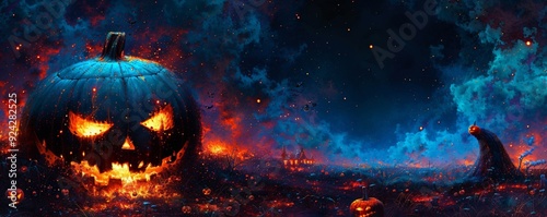 © Olga, Fototapeta premium Happy abstract dark Halloween background with creepy pumpkins and scary smoke clouds. Jack pumpkin head. Illustration for card or poster for Halloween greetings. With copy space