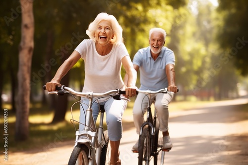 Obraz premium Happy active senior couple ride on a bikes in a summer park. AI generative