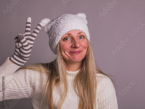© Sinica Kover, Obraz premium happy adult woman in funny kids hat with ears showing the sign of victory, hand in striped gloves