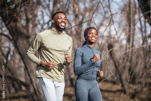© littlewolf1989, Fototapeta premium Happy african american couple running together outdoors