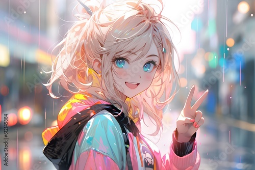 © yj, Obraz premium happy and beautiful anime girl smiling and showing a peace sign in the street, wearing a windbreaker, colorful art style. generative AI