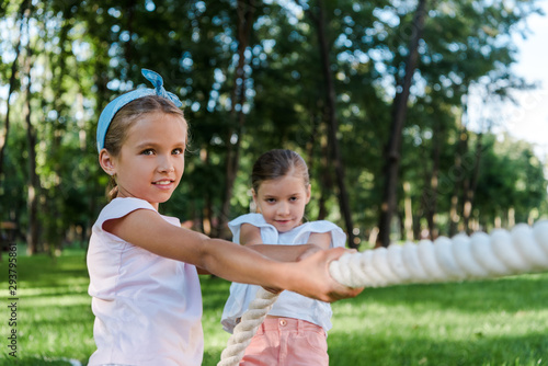 Fototapeta premium happy and cute kids competing in tug of war outside