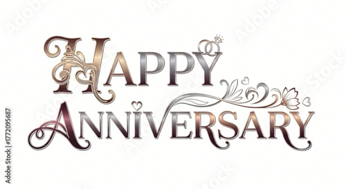 © WisChi, Obraz premium Happy Anniversary Celebration: A decorative art piece featuring the words Happy Anniversary in elegant, ornate script, signifying love, commitment, and celebration.