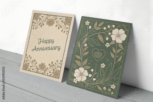 Obraz premium Happy Anniversary Floral Cards, Beige and Green Botanical Designs