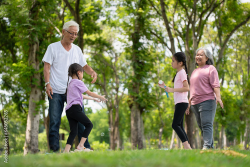 © surachetkhamsuk, Obraz premium Happy Asian family children having fun and playing with her grandparents in the park