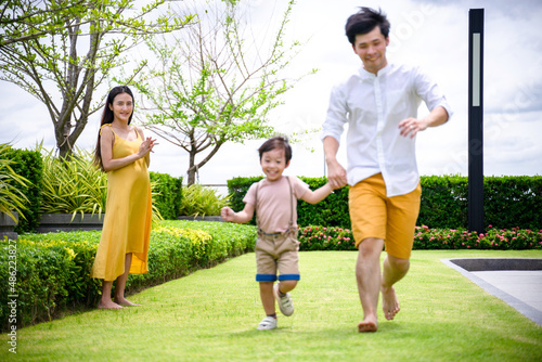 Fototapeta premium happy asian family playing on the lawn at home.