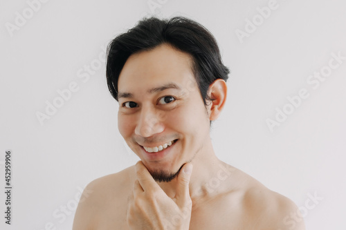 Obraz premium Happy Asian man face satisfied the skincare product applied on his face.
