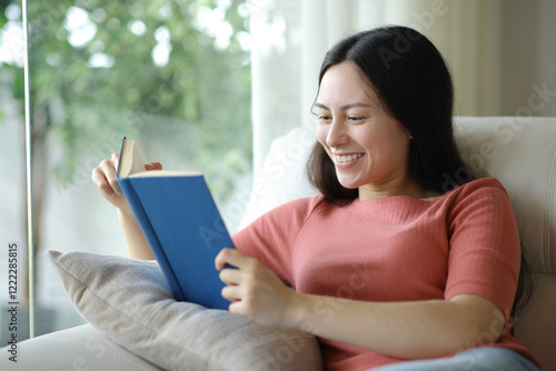 © Antonioguillem, Obraz premium Happy asian woman reading a paper book on a couch