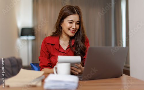 © David, Fototapeta premium Happy asian woman using laptop while working remotely from home in living room