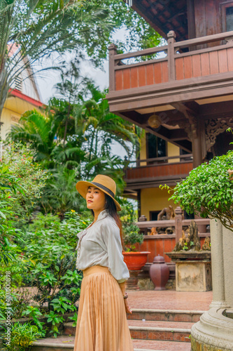 Obraz premium Happy asian woman walking outdoors in Buu Long Pagoda in Ho Chi Minh City. A...