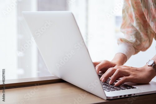 Fototapeta premium Happy Asian young woman making a video conference on laptop computer while living in the living room.