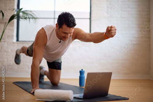 Fototapeta premium Happy athlete working out while watching exercise tutorial on laptop.