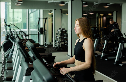 © Zhuravleva Katia, Fototapeta premium Happy athletic woman jogging on treadmills in a gym.