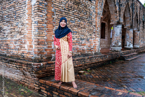 Fototapeta premium Happy attractive muslim woman travel in Pattani province, Thailand. Posing...
