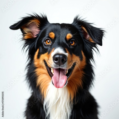 © Viktor, Fototapeta premium Happy Australian Shepherd dog portrait on white background. Cute tricolor pet looking at camera, smiling. Domestic purebred mammal with open mouth, tongue out sits in studio. Obedient funny friendly