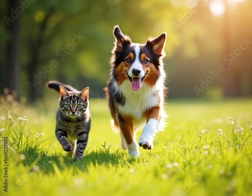 © Viktor, Fototapeta premium Happy Australian Shepherd dog walks with cute tabby cat through green grassy field during sunny day. Natural sunlight illuminates scene, creating warm atmosphere of animal friendship, companionship.