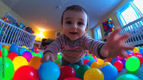 © ABIDZAR ALFAREZ, Obraz premium Happy Baby Playing In Colorful Ball Pit