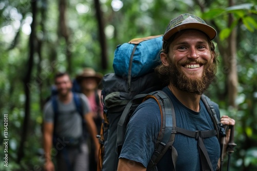© Vision Bliss, Obraz premium Happy backpacker and his friends hiking in forest
