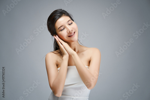 Obraz premium Happy beautiful asian girl with the fresh skin in grey colour background....