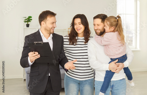 Fototapeta premium Happy beautiful couple with small child and friendly realtor making real estate deal, agent planning sale purchase agreement or rental contract, clients dreaming of new flat, explaining contract