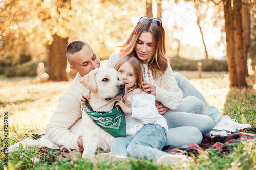 Obraz premium Happy beautiful family with dog labrador is having fun are sitting on green grass in park.