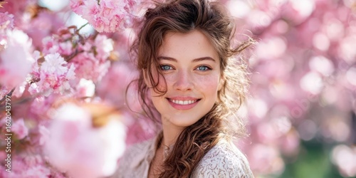 Fototapeta premium Happy Beautiful Woman in Spring Cherry Blossom Background