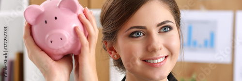 Fototapeta premium Happy beautiful woman shaking funny piggybank