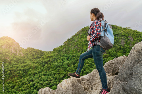 Fototapeta premium Happy beautiful woman traveler with backpack standing on top of a mountain and enjoying sunset view of thailand
