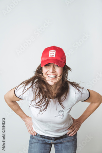 © karrastock, Fototapeta premium Happy beautiful woman with red hat in studio