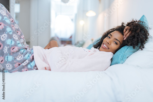 Fototapeta premium Happy beautiful young black woman relaxed lying down in the bed .