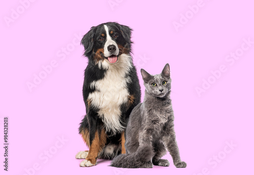 © Eric Isselée, Obraz premium Happy Bernese mountain dog and grey Nebelung cat sitting together, looking at the camera isolated on pink background