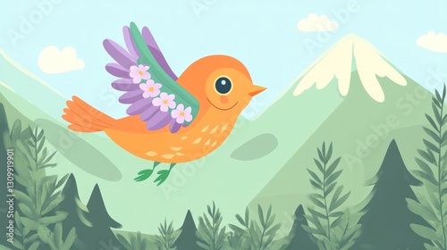 © Zeva, Naklejka premium Happy bird flying over mountains, spring landscape, nature illustration, kids book