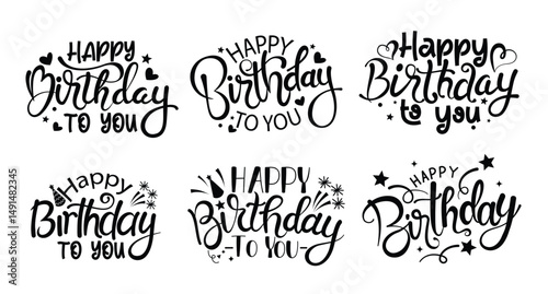 Fototapeta premium Happy birthday calligraphy clipart set. Happy birthday to you text, greeting, wishes and typography clip art in black font graphic elements collection vector illustration.