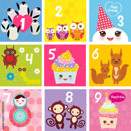 © EkaterinaP, Fototapeta premium Happy Birthday Card design with Kawaii Cupcake squirrel ladybug monkey matryoshka owl penguin, pastel colors. Vector